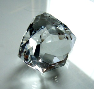 同時に無色透明の合成蛍石のルースも入手しました。一般に比重の大きな物質は屈折率も高くなりますが、蛍石は比重が3.18と大きいのに屈折率が1.43と大変低い価を示す不思議な鉱物です。
