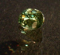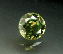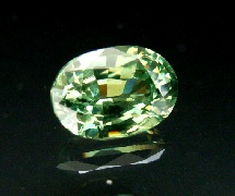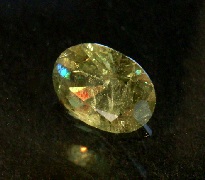 The best Ural demantoid contains as high as two to three percent of chromium, resulting in deep emerald green. High quality crystals represent less than 10% of all and the rest are pale greenish yellow color as shown in this photo. Strong dispersion, typical to demantoid, is clearly seen, thanks to pale body color.0.80ct 7.2x5.0mm R.I. 1.879 Ural Mountains, Russia